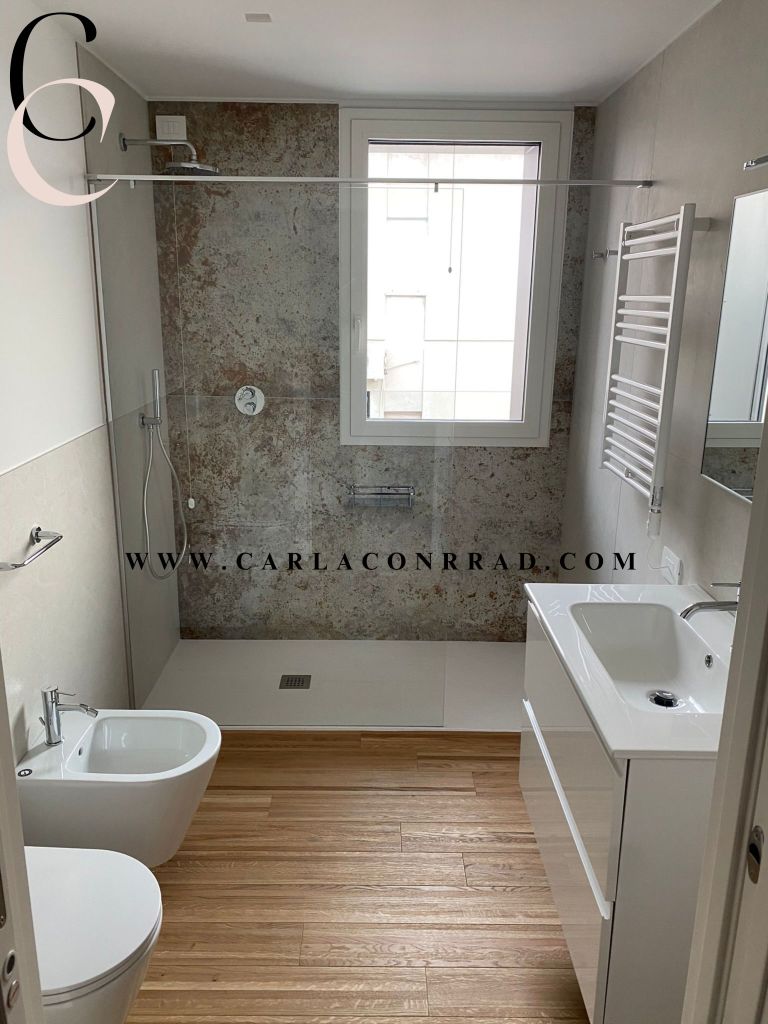 Bagno con Doccia Walk-In: Il bagno principale è un esempio di eleganza e modernità. Caratterizzato da piastrelle di design, dispone di una spaziosa doccia walk-in per un’esperienza di lusso. Il bagno è completo di un lavabo, specchio a LED e toilette.