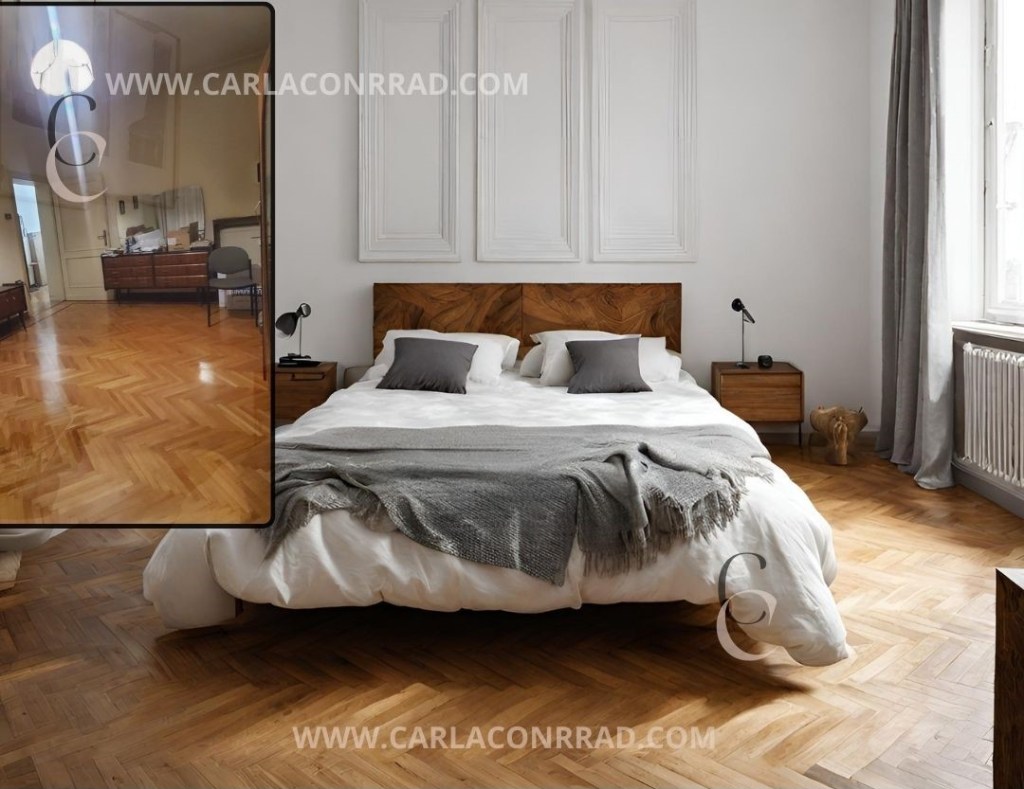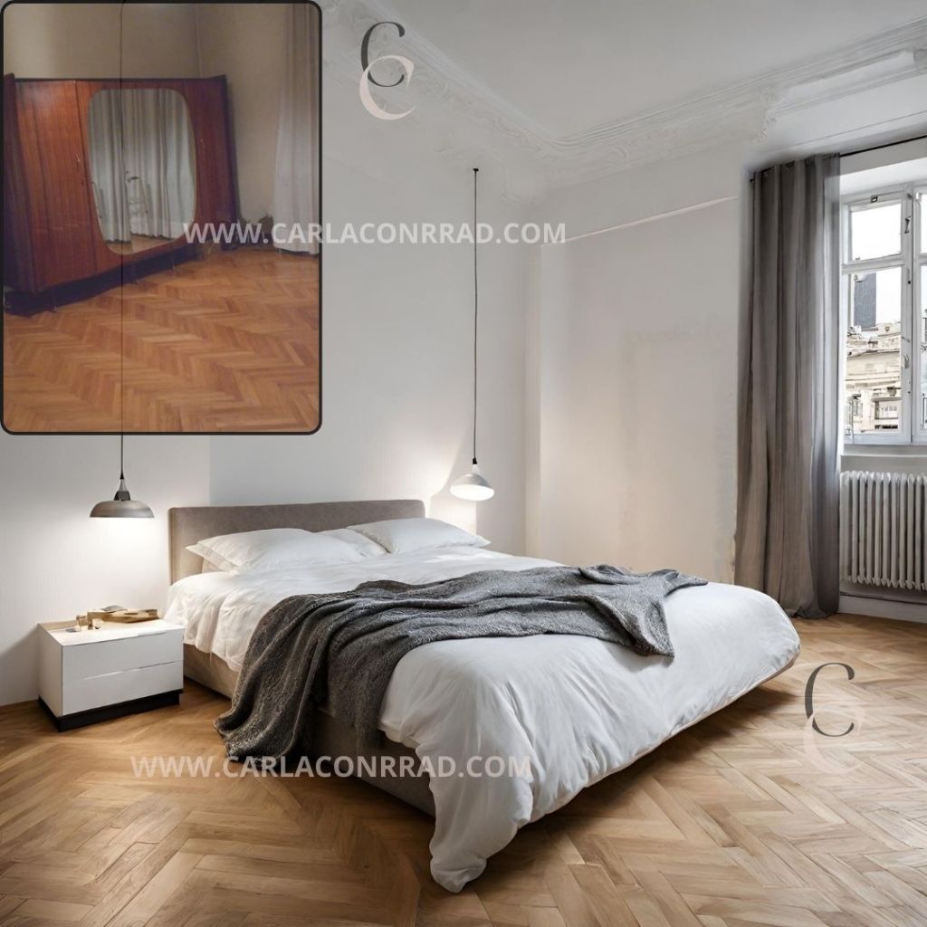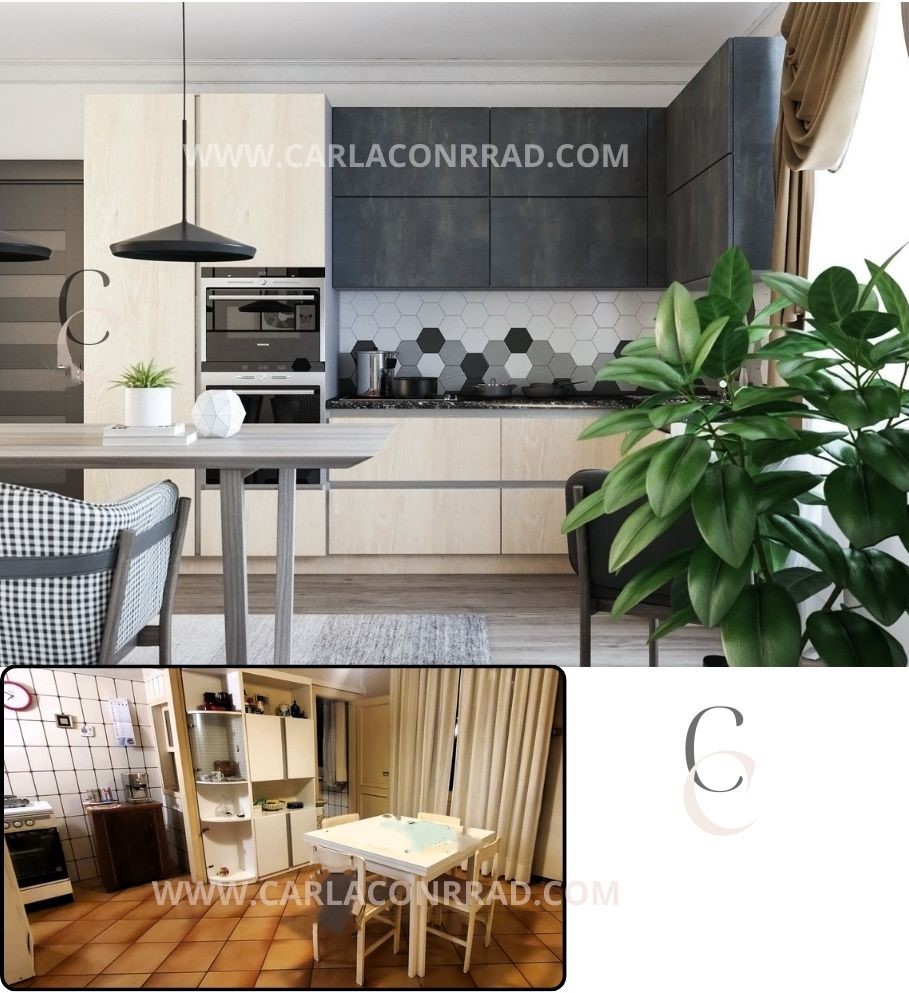 Foto attuali incontrano rendering per mostrare il potenziale trasformativo di lavori di ristrutturazione nelle stanze.