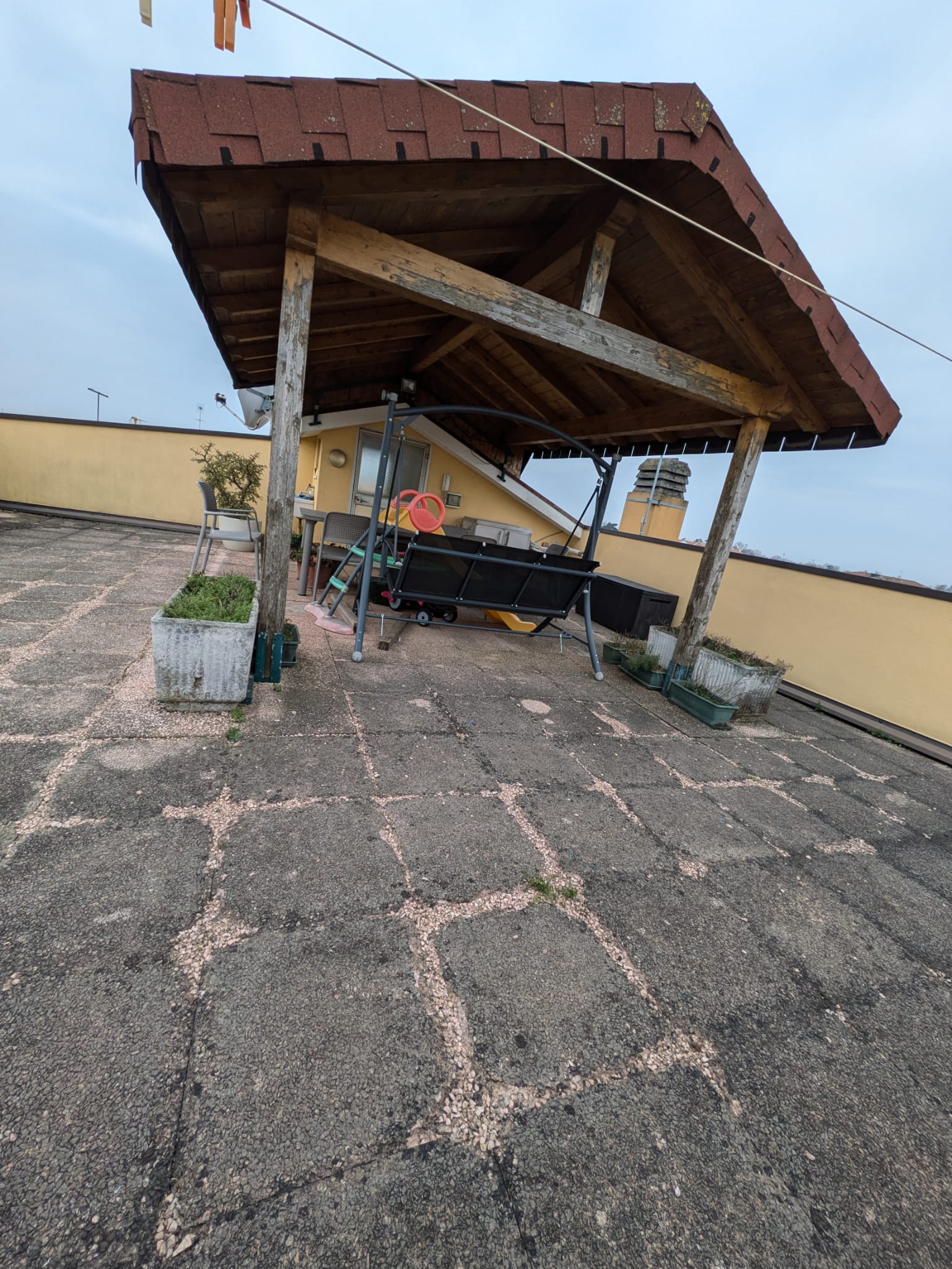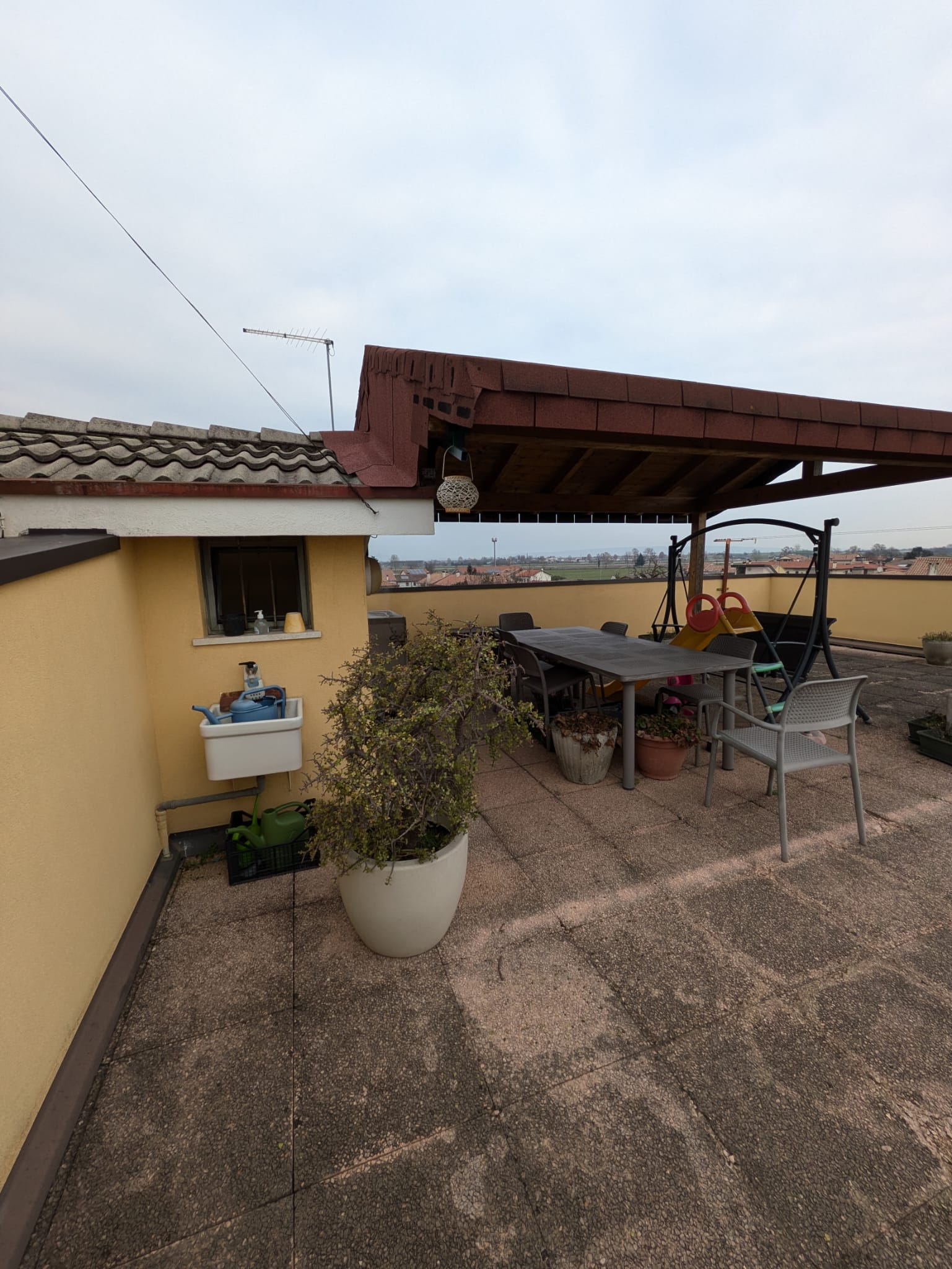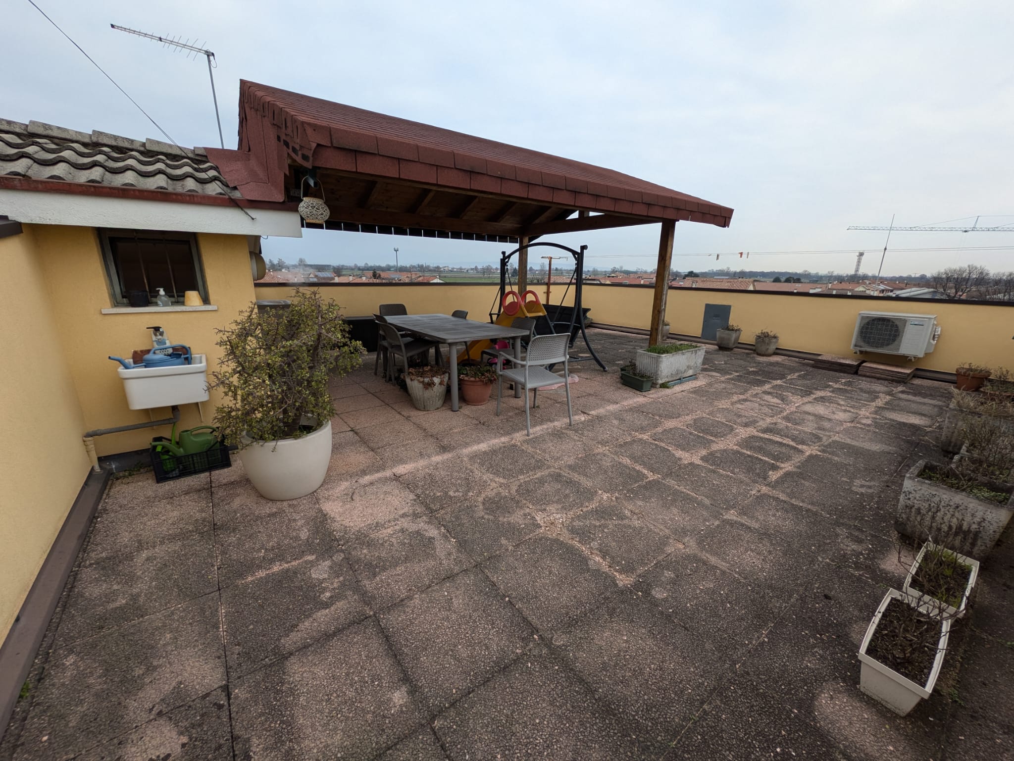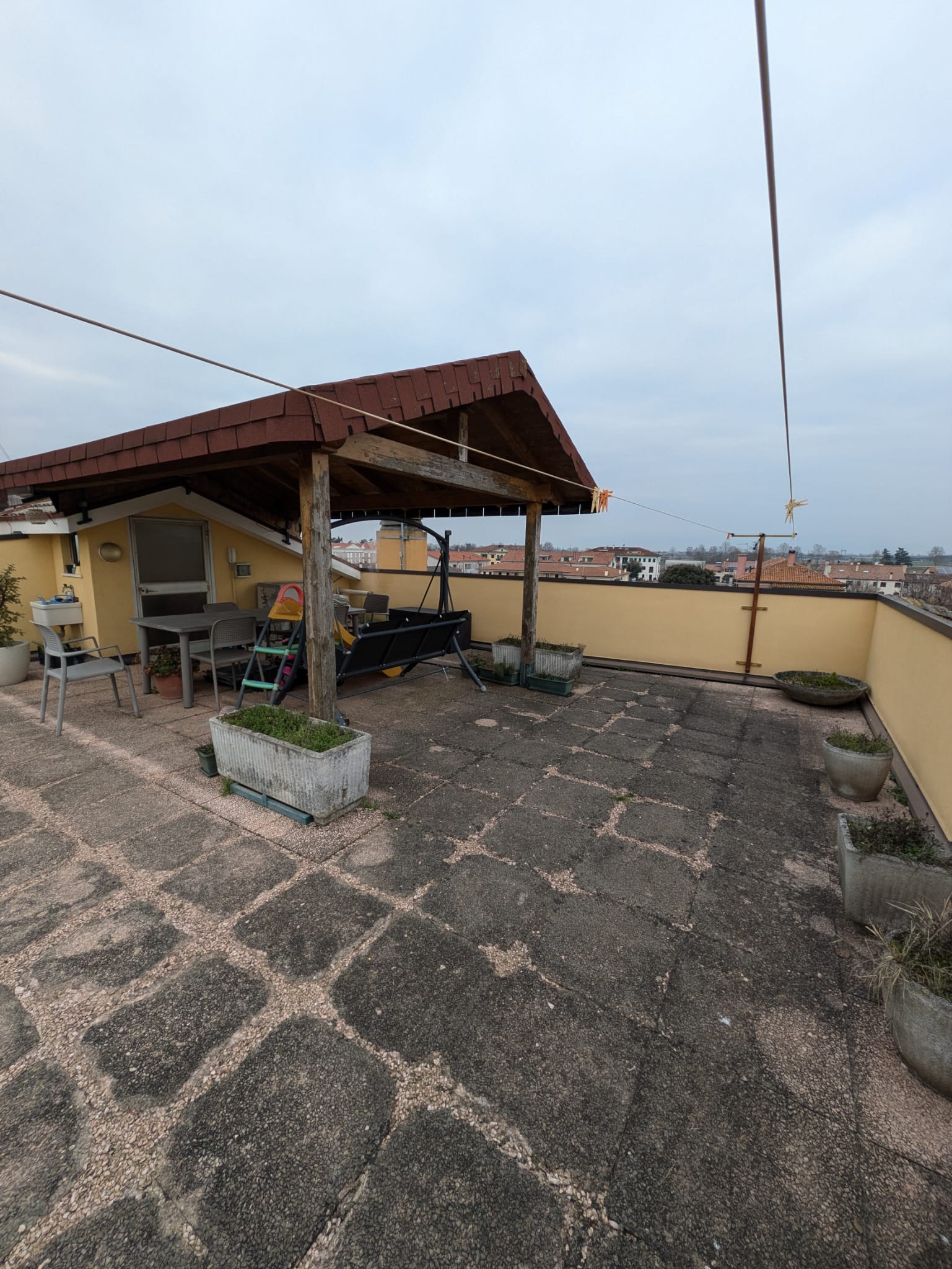 Terrazzo panoramico di 60 mq, situato sopra l’appartamento, dotato di lavabo e citofono, che permette di rispondere e aprire il portone comodamente, senza dover scendere.