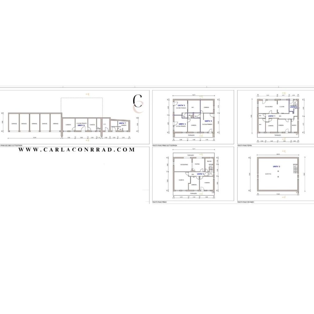 Primo Piano Sottostrada: Il primo piano sottostrada ospita tre mini appartamenti, di cui due vantano una terrazza privata. Ogni mini appartamento comprende un open space con cucina e salotto, una camera da letto e un bagno. Le terrazze aggiungono un elemento di lusso e la possibilità di godere di spazi all’aperto.