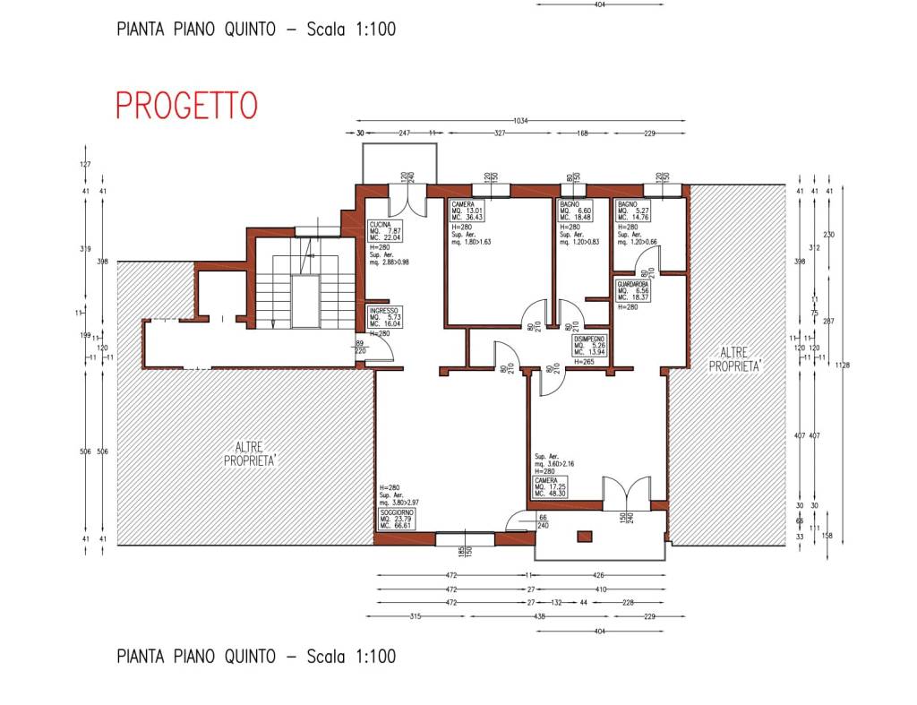 L’appartamento si trova al quinto piano di una palazzina di sei piani servita da ascensore. L’ingresso conduce a una cucina abitabile con terrazza panoramica e a un luminoso soggiorno, anch’esso dotato di terrazzo. Un disimpegno separa la zona notte, composta dal bagno principale finestrato, da una camera singola e da una camera matrimoniale con cabina armadio e bagno privato finestrato. Il soggiorno e la camera matrimoniale si affacciano su un ampio terrazzo. Completa la proprietà un garage.